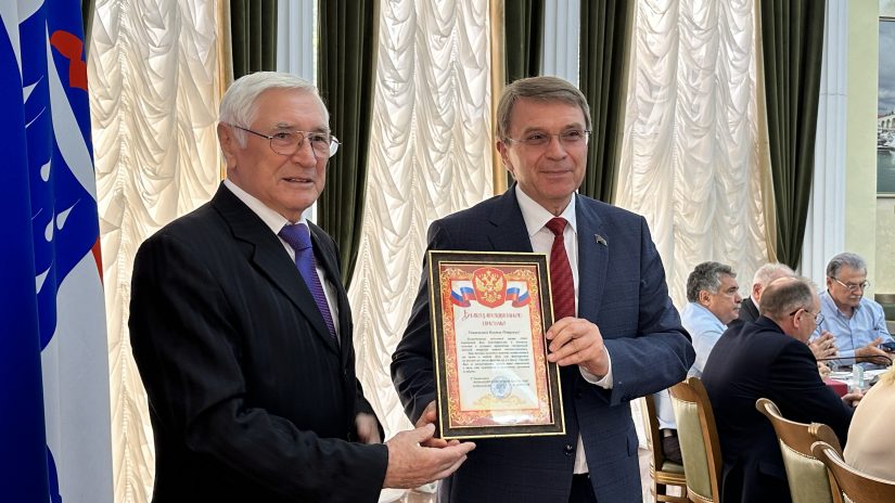 Председатель совета ветеранов города Сочи Николай Шуреков вручил председателю Городского Собрания Сочи Виктору Филонову Благодарственное письмо от командира одной из войсковых частей за помощь военнослужащим в условиях проведения специальной военной операции.