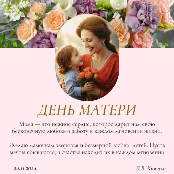 Дорогие наши мамочки! Тепло и сердечно поздравляю вас с Днем матери! Этот день наполнен особым значением, ведь он посвящен самым близким и дорогим людям в нашей жизни. Материнская любовь, забота и поддержка сопровождают нас на протяжении всей жизни, и в этот день мы можем выразить нашу благодарность за все, что они для нас сделали.
