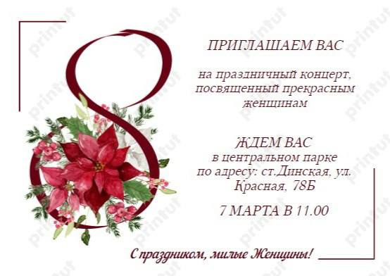 На базе МАУК "Динской парк культуры и отдыха", расположенном по адресу: ст. Динская, ул. Красная, 78Б, 7 марта в 11.00 будет проходить праздничный концерт, посвященный женскому дню.