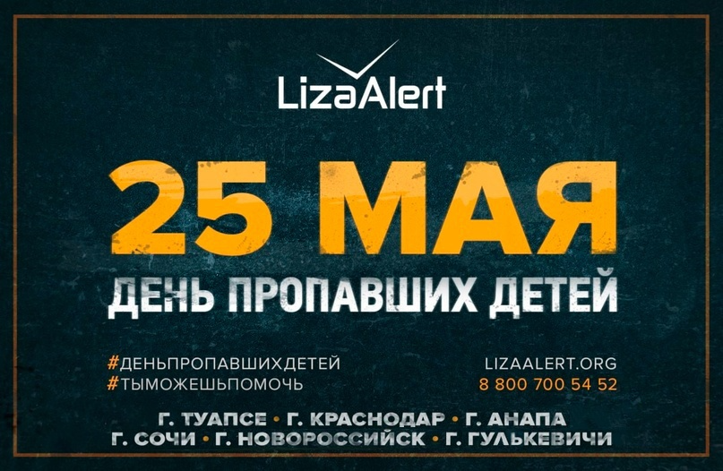 25 мая с 15:00 до 19:30 в амфитеатре парка им. М.В. Фрунзе волонтеры добровольческого поискового отряда «ЛизаАлерт» проведут акцию, в ходе которой расскажут жителям города, как себя вести при таких чрезвычайных ситуациях, как самовольный уход несовершеннолетних из дома.