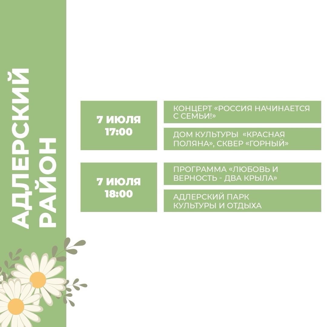 Как сообщили в мэрии, в Сочи ко Дню семьи, любви и верности состоится свыше 40 праздничных мероприятий.