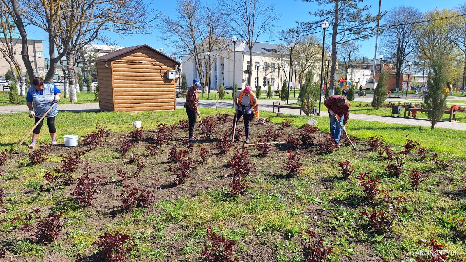 В Центральном сквере собран бросовый мусор, очищены урны, подметены пешеходные дорожки, политы цветочные клумбы, проводится прополка клумбы с розами.