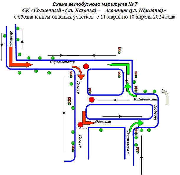 Из микрорайонов автобусы маршрута № 7 будут следовать по привычной схеме до центра города, от Гостиного двора прямо по улице К.Либкнехта до улицы Ростовской – направо по улице Ростовской до улицы Первомайской – налево по улице Первомайской до улицы Ясенской – далее по маршруту.