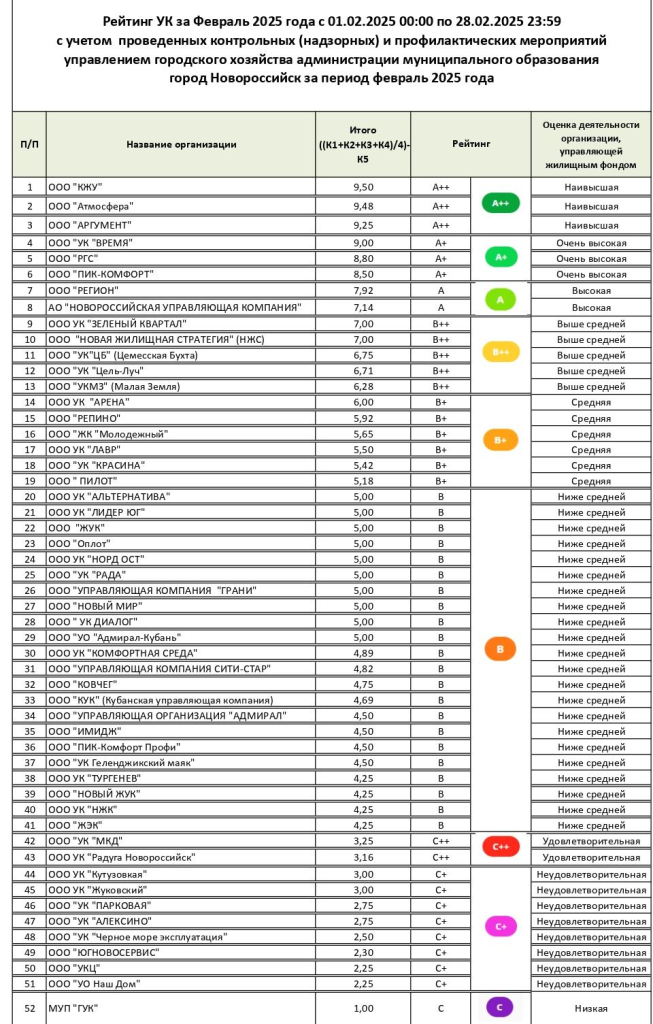 На платформе «Мой-Новороссийск.рф» составлен ежемесячный рейтинг управляющих компаний города-героя Новороссийска за февраль 2025 года