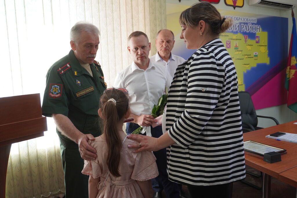 Глава Павловского района Роман Парахин, председатель Совета Виктор Лесовой и военный комиссар Павловского и Крыловского районов Валерий Григоренко вручили государственную награду вдове героя.