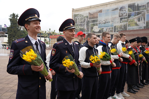 – К праздничной акции, посвященной Международному женскому дню, сегодня присоединились все мужчины, которые обеспечивают общественную безопасность нашего города. Сегодня они дарили сочинкам и гостьям курорта цветы на гостевых маршрутах, в парках и скверах, на набережных, – рассказал заместитель главы Сочи Вадим Снегирев.