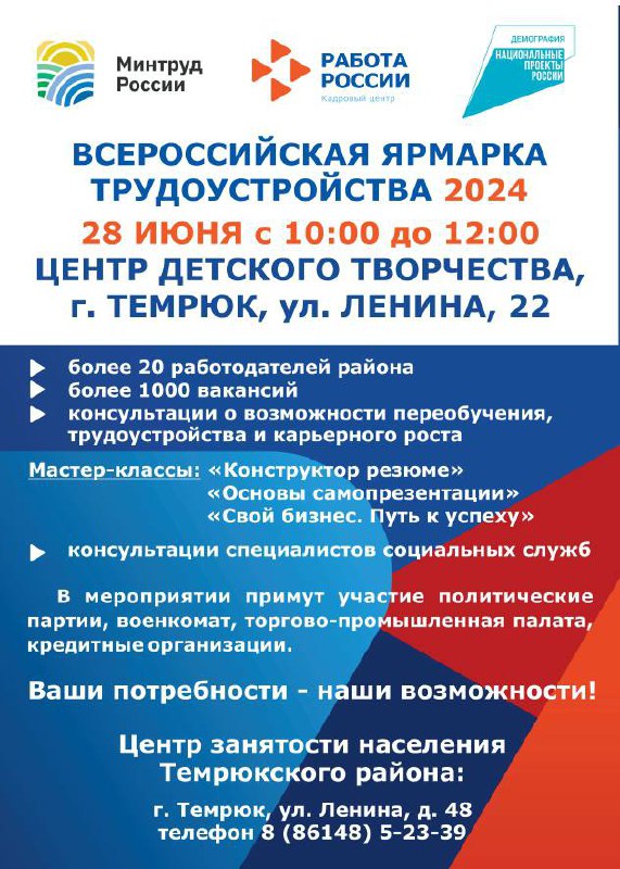 Центр занятости Темрюкского района приглашает принять участие во Всероссийской ярмарке трудоустройства «Работа России.