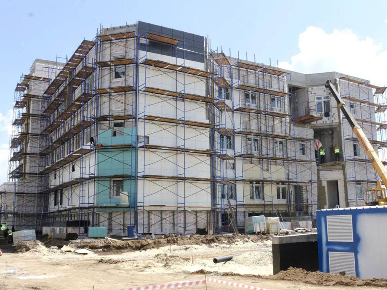На сегодняшний день выполняются внутренние и наружные отделочные работы, монтаж инженерных сетей, кровельные работы, стяжка пола внутри здания, вертикальная планировка территории и установка постоянного ограждения.